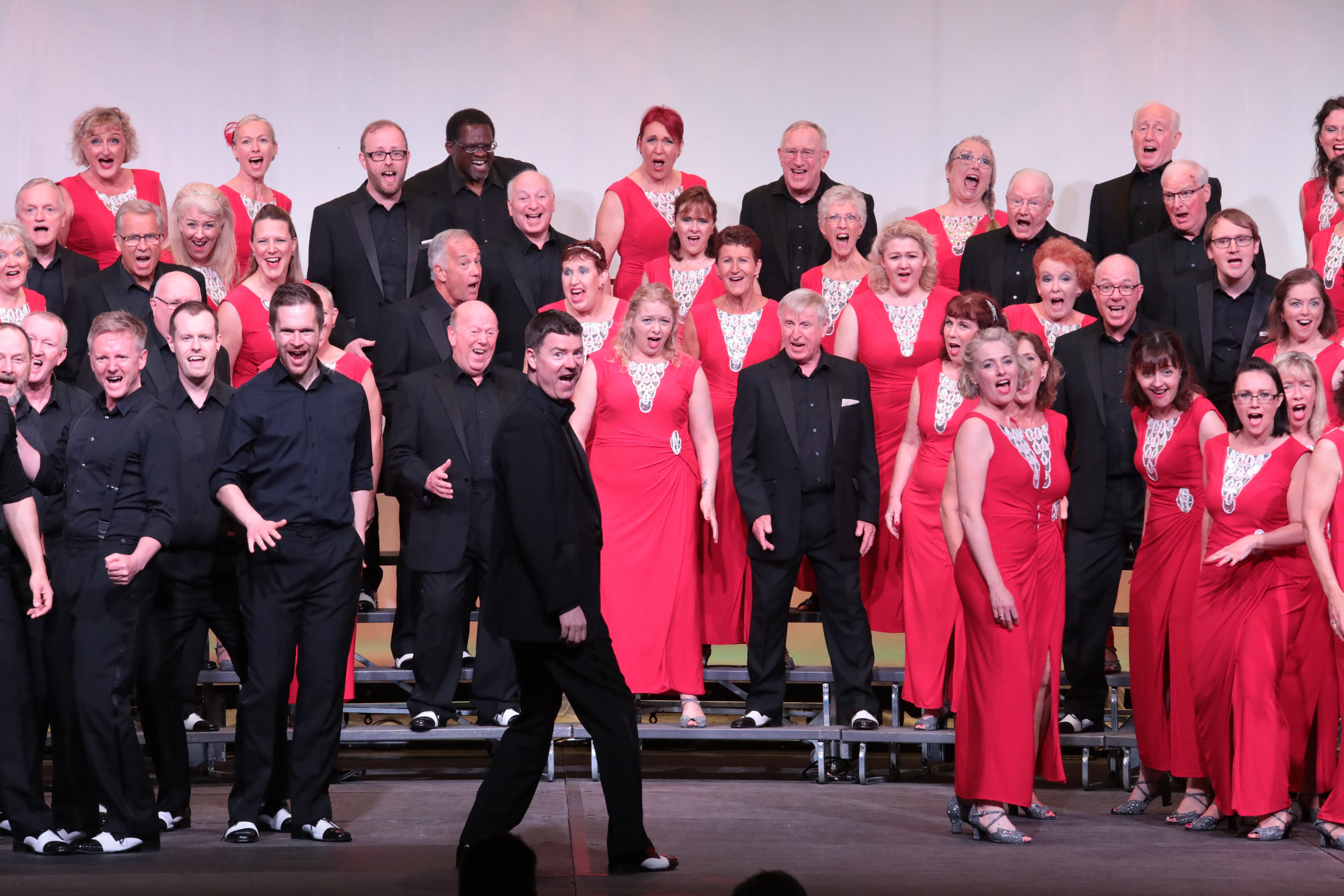 Instead, we ventured down a new path that was fun and different: we joined forces with the ladies of Amersham A Capella and entered the Mixed Chorus competition, a new BABS event instigated in 2017. The combined ensemble, with the Queen-inspired name "A Kind Of Magic", put a total of 106 singers on stage, stunningly clothed in red and black, and our set of 'Footloose' and 'Somebody To Love' won first place. In the male chorus contest, our swansong as retiring champions featured performances of 'Tonight, Tonight' and 'Somewhere', the first two of what would become a trio of West Side Story favourite songs to be added to our repertoire.